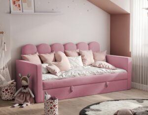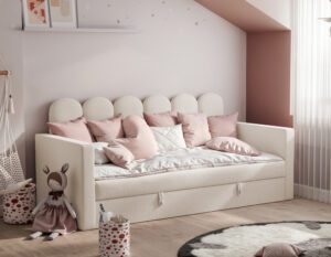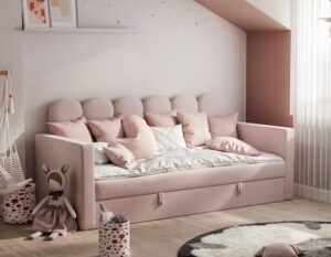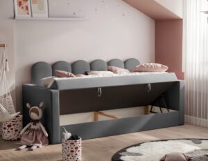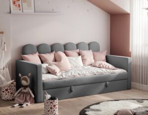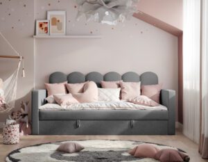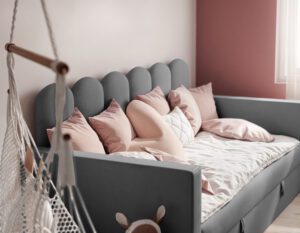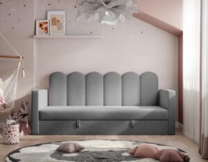 Nowoczesne i praktyczne rozwiązanie do pokoju najmłodszych. Zaprojektowane z myślą o wygodzie, bezpieczeństwie i estetyce, świetnie sprawdzi się zarówno jako miejsce do spania, jak i dzienna sofa.