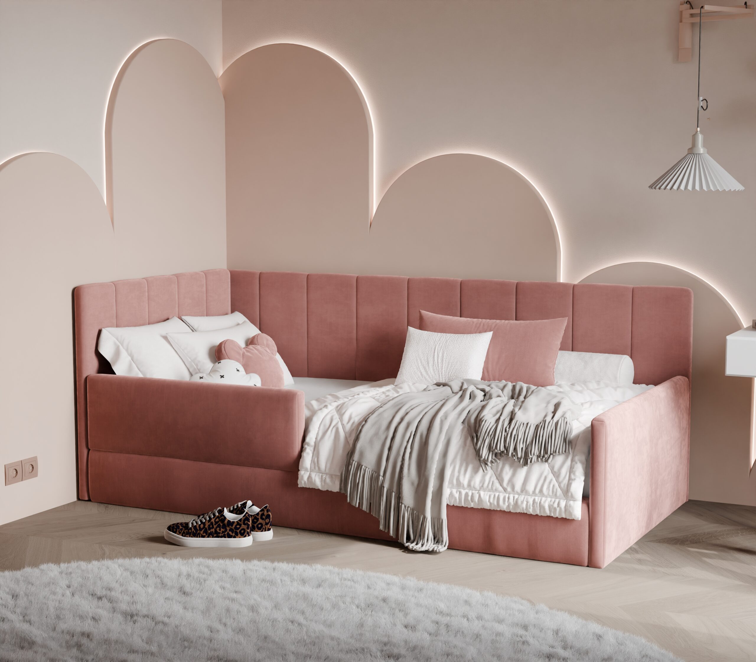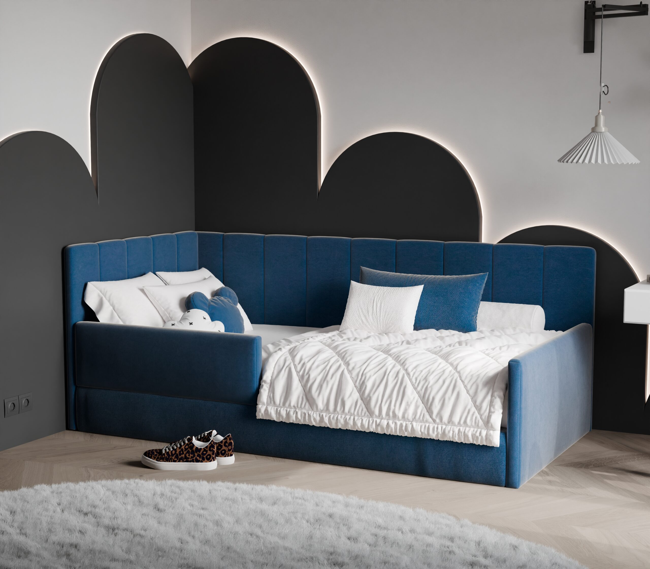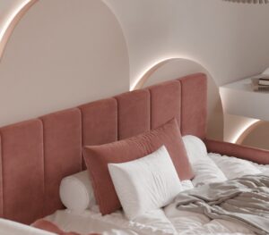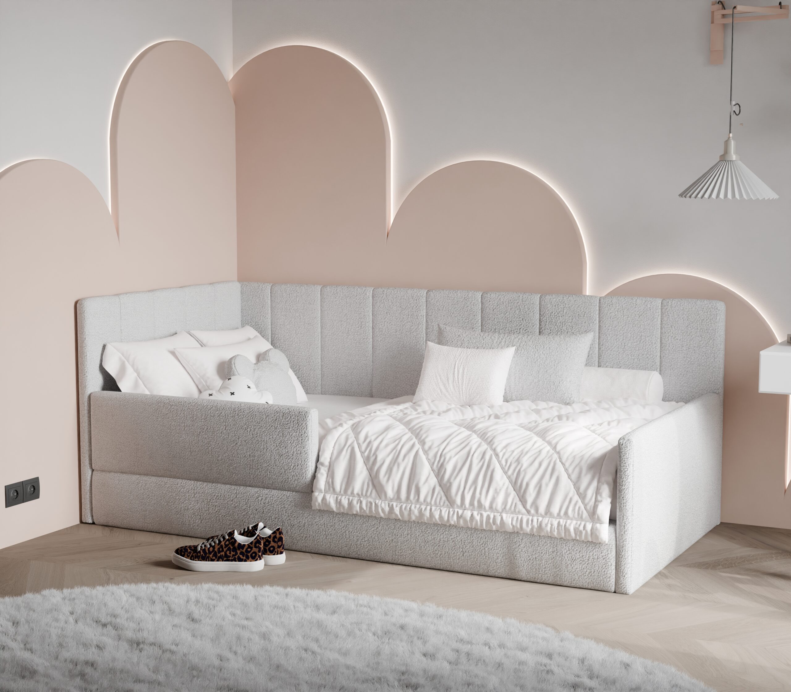 Łóżko BAMBI to doskonały wybór dla najmłodszych – łączy komfort, bezpieczeństwo i wyjątkowy design, tworząc przytulną przestrzeń do snu i zabawy. Dzięki swojej niskiej konstrukcji i miękkim dekoracyjnym tapicerowanym bokom jest bezpieczne i idealne jako pierwsze łóżko dla dziecka, zapewniając spokojny sen i swobodę użytkowania.