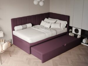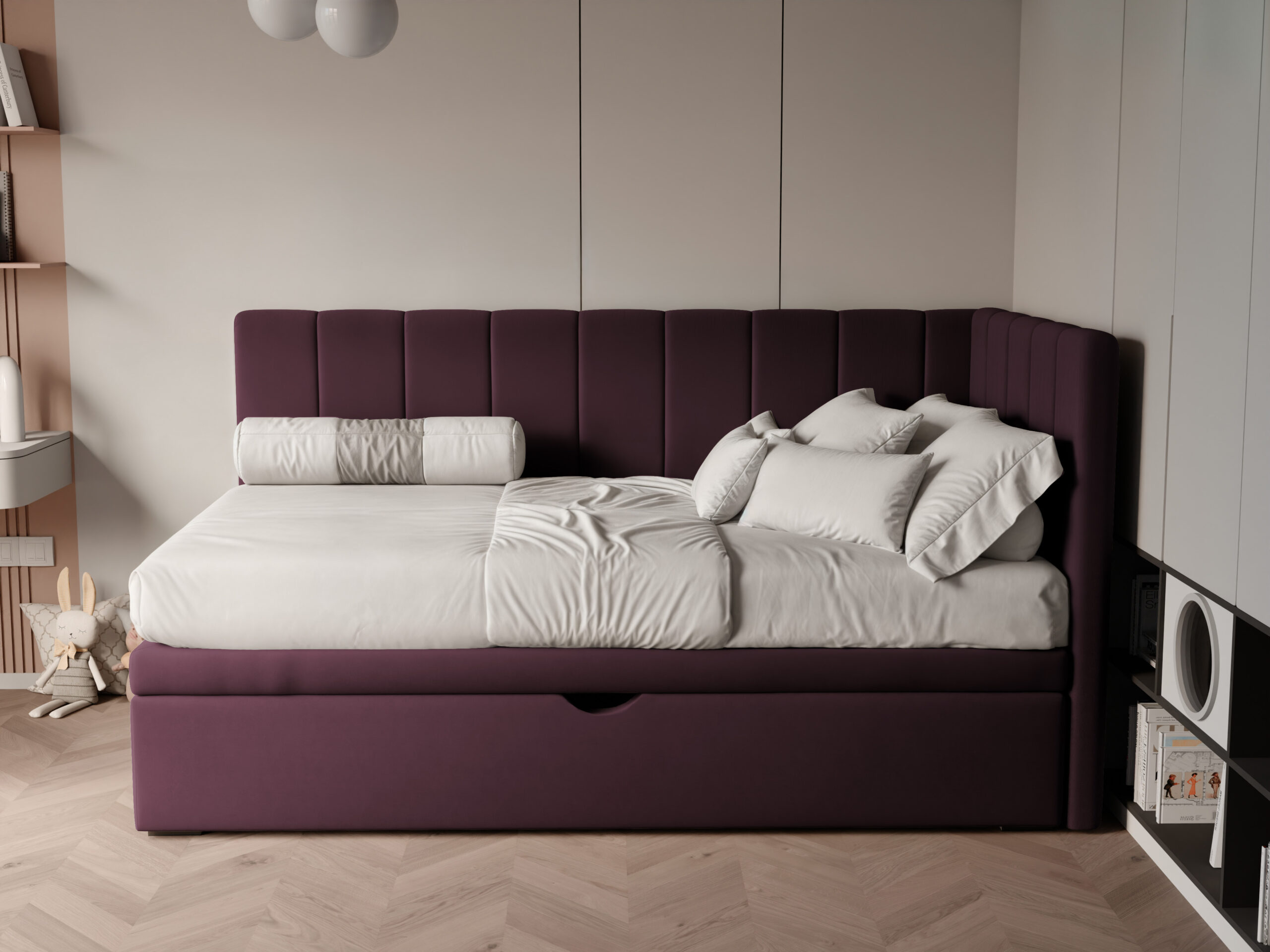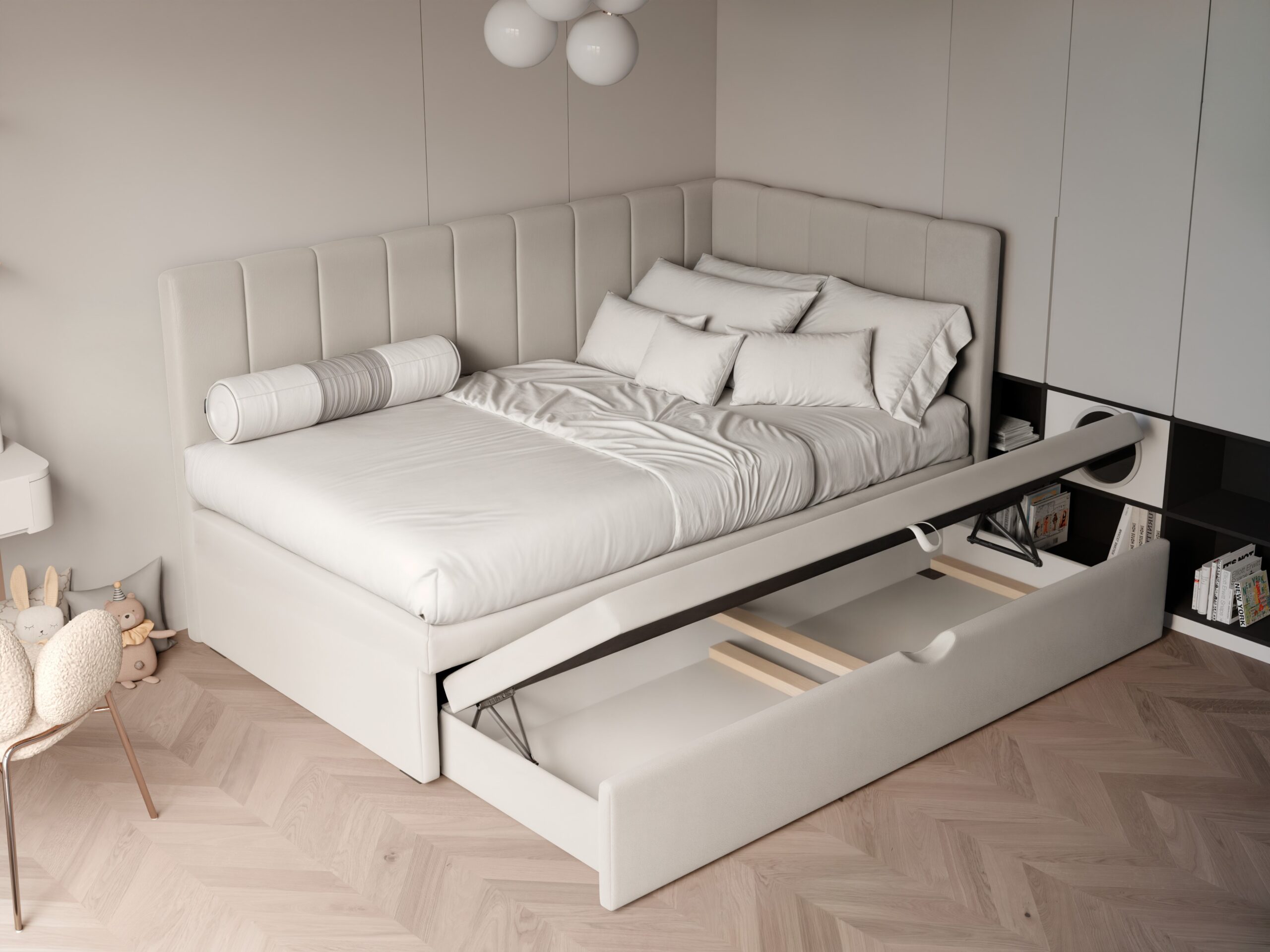 Łóżko wyposażone jest w praktyczną szufladę na pościel, co sprawia, że organizacja przestrzeni staje się łatwiejsza. Wysuwana szuflada pomieści kołdry, poduszki, a także zabawki czy inne drobiazgi, pomagając utrzymać porządek w pokoju