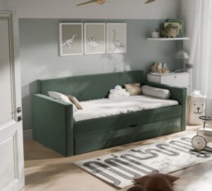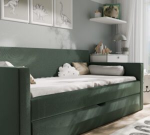 Łóżko wyposażone jest w praktyczną szufladę na pościel, co sprawia, że organizacja przestrzeni staje się łatwiejsza. Wysuwana szuflada pomieści kołdry, poduszki, a także zabawki czy inne drobiazgi, pomagając utrzymać porządek w pokoju
