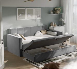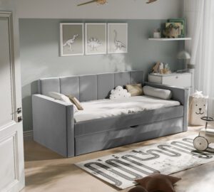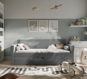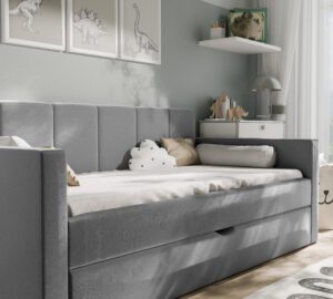 Nowoczesne łóżko tapicerowane z funkcją przechowywania – idealne do pokoju dziecięcego lub młodzieżowego.