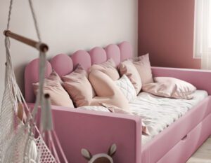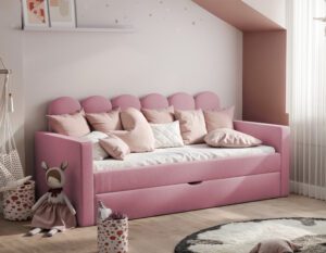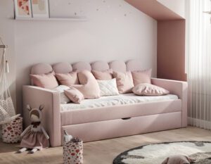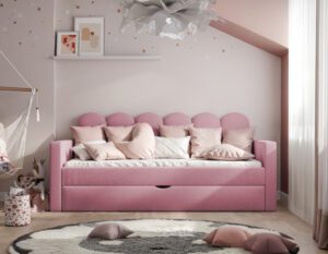 Jasno różowe łóżko wykonane jest w tkaninie MATT VELVET 61