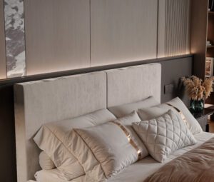 Charakterystycznym elementem łóżka są pionowe przeszycia na wysokim zagłówku oraz froncie ramy, które dodają mu wyjątkowego charakteru i wizualnej lekkości. Dzięki nim mebel zyskuje głębię i niepowtarzalny styl, będąc jednocześnie subtelnym akcentem dekoracyjnym.