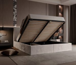 z pojemnikiem na pościel – idealnym dla osób poszukujących dodatkowej przestrzeni do przechowywania. Wygodny mechanizm otwierania ułatwia dostęp do pojemnika, co sprawia, że przechowywanie kołder, poduszek czy sezonowej pościeli staje się wyjątkowo praktyczne.