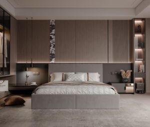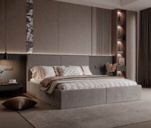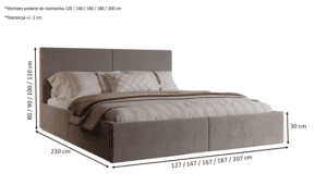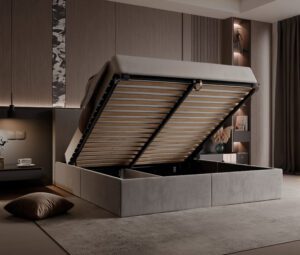 Solidna rama łóżka, elegancka tapicerka, praktyczny pojemnik na pościel –  Dzięki wygodnemu mechanizmowi podnoszenia, dostęp do pojemnika jest szybki i łatwy, co umożliwia oszczędne zarządzanie przestrzenią.