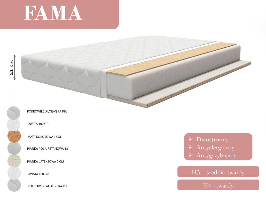 Materac FAMA to wysokiej jakości materac, który łączy w sobie trzy różne warstwy: kokosową, piankę poliuretanową o grubości 18 cm i warstwę lateksową.